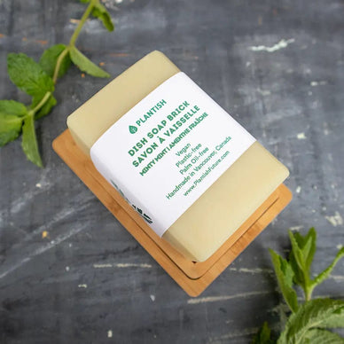 Our bestseller solid dish soap brick (13oz) is now available in Minty Mint! Our plastic free dish soap brick eliminates the need to purchase dish soap in plastic bottles. Gentle on the hands, it cuts grease effectively and pairs perfectly with a dishcloth, loofah, and natural bristle brushes. It is also a powerful stain remover for any oil and stain on fabrics such as sponge cloths and produce bags.